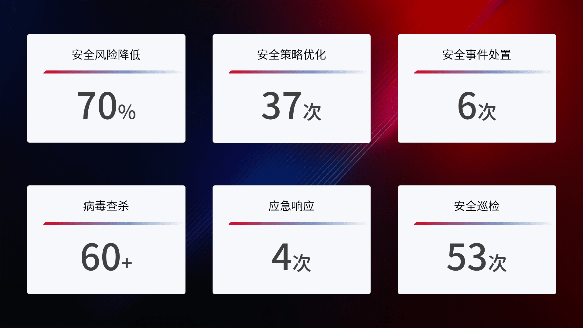 提供全面的安全事件报告体系,,,包括处置报告、、、、周报、、、季度和年度总结,,结合持续监控,,,帮助客户深入了解网络安全状况。。。。